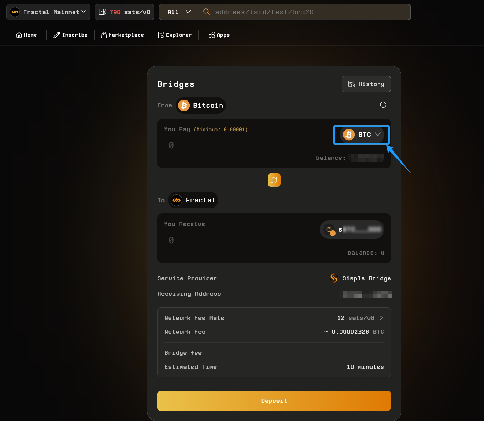 - 系统会自动计算并在 You Receive 字段中显示您将收到的金额。验证接收地址和费用。如果一切正确,点击 Deposit