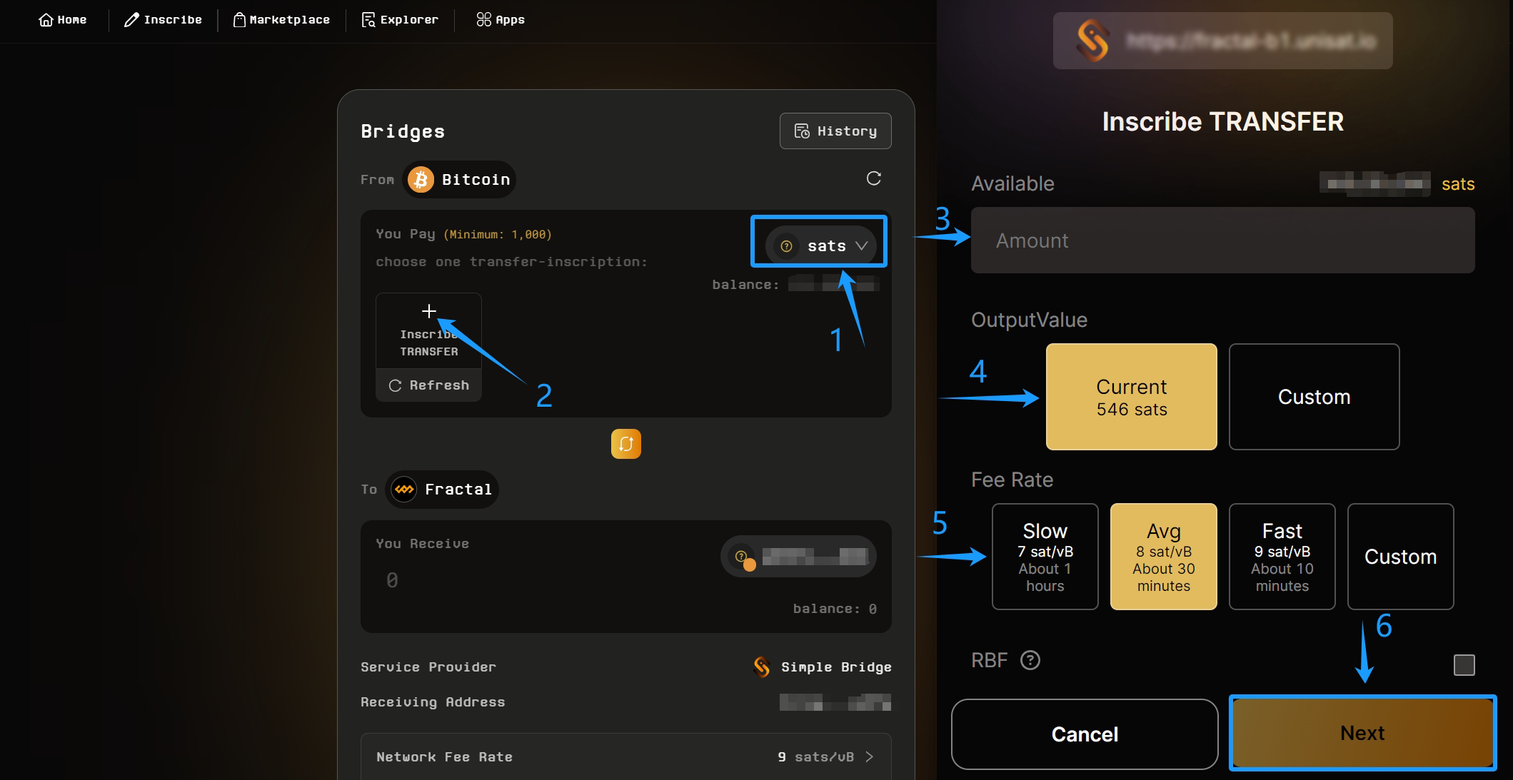 - 对于 BRC-20:首先需要执行铭刻转账。从代币名称旁的下拉菜单中选择要桥接的代币,然后选择要桥接的转账。