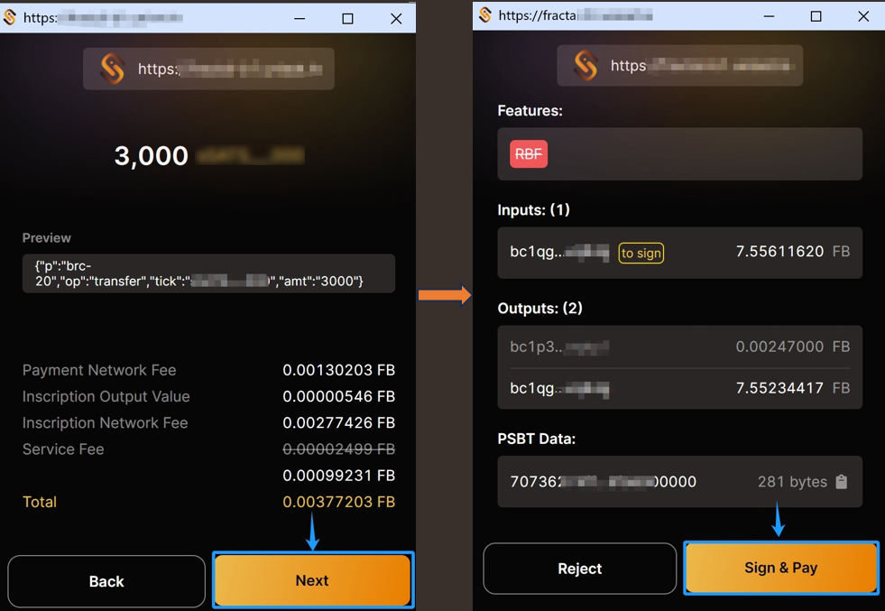 - 仔细检查签名窗口中的输入和输出。确认无误后,点击"Sign & Pay"完成铭刻转账